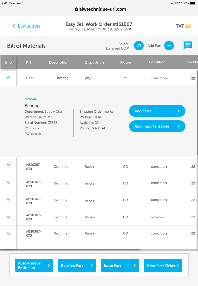 My first large freelance project, I was referred after my work at Bombardier for the trouble-shooting platform. Already aware of the MRO (Maintenance, Repair and Operations) space and its challenges, I jumped right in to help Monica Badra (CTO) create a platform that would meet AJW’s business goals as well as pain points happening on the shop floor.